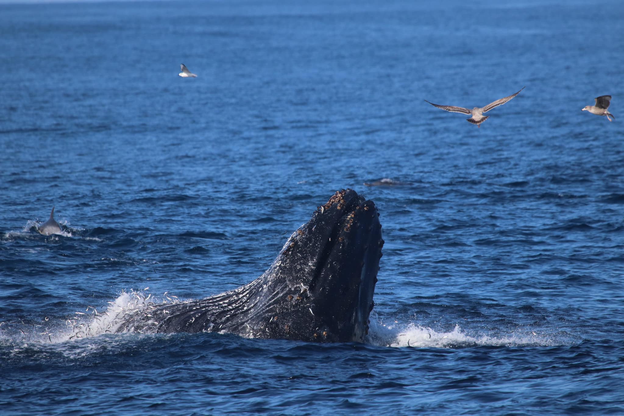 Fall isn’t just about pumpkins and cozy sweaters—it’s also a season of movement for marine life. Offshore, whales continue their migratory journeys, and lucky guests aboard Oceanside Adventures may spot blue whales finishing their summer feeding or humpbacks passing through the California coast. Each sighting feels even more magical against the backdrop of crisp air and changing skies.
