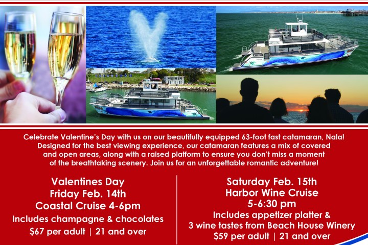 Join us for a romantic Valentine’s Day adventure! Sail with us aboard our 63-foot, 45-passenger, beautifully equipped, one-level, fast catamaran. This catamaran is perfect for optimal viewing, with both covered and open areas as well as seating throughout. The ticket price includes champagne and chocolates. There is no better place to enjoy a romantic cruise with your loved one!